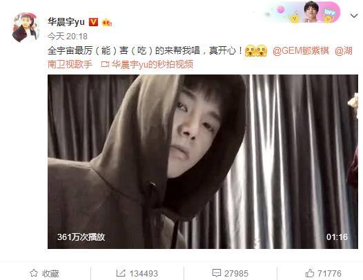 华晨宇在微博透露邓紫棋将作为自己的帮唱嘉宾助阵《歌手》总决赛,并主动cue邓紫棋称:“全宇宙最厉害的来帮我唱,真开心!”那边邓紫棋也在微博用同句式呼应:“来帮全宇宙