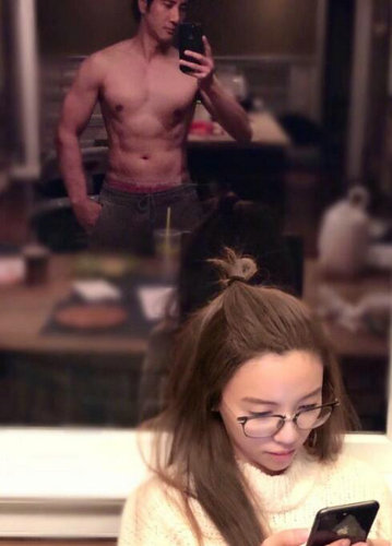 照片中,王力宏裸露上身,露出完美是腹肌,非常的性感迷人,手拿相机自拍,而一旁的李靓蕾完全不被吸引,沉浸在自己的手机里,画面非常的逗趣。