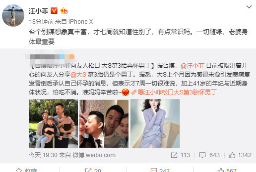 4月11日晚,汪小菲针对港媒爆料“大S三胎怀的是男孩”这一消息进行辟谣:“台个别媒想象真丰富,才七周就知道性别了,有点常识吗。一切随缘,老婆身体最重要!&rdquo