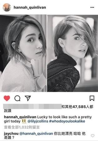 据台湾媒体报道,昆凌和周杰伦2014年结婚,生下一双可爱的儿女,她在产后光速恢复身材,外表看不出来已经是2个孩子的妈,18日她在IG上传一张短发侧面照,和好莱坞女演员莉莉-柯林斯很相似,不过老公周杰伦现身留言大赞:“你比她漂亮!”