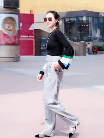 照片中的她素颜出镜,面戴墨镜,身穿黑色彩色袖口上衣,灰色阔腿甩裤,长腿吸睛,灰色黑头高跟鞋,盘起头发,看起来利落大方,优雅有气质。