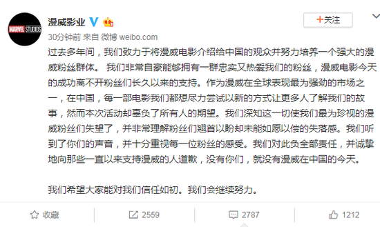 过去多年间,我们致力于将漫威电影介绍给中国的观众并努力培养一个强大的漫威粉丝群体。 我们非常自豪能够拥有一群忠实又热爱我们的粉丝,漫威电影今天的成功离不开粉丝们长久以来的支持。作为漫威在全球表现最为强劲的市场之一,在中国,每一部电影我们都想尽力尝试以新的方式让更多人了解我们的故事,然而本次活动却辜负了所有人的期望。我们深知这一切使我们最为珍视的漫威粉丝们失望了,并非常理解粉丝们翘首以盼却未能如愿以偿的失落感。我们听到了你们的声音,并十分重视每一位粉丝的感受。我们对此负全部责任,并诚挚地向那些一直以来支持漫威的人道歉,没有你们,就没有漫威在中国的今天。