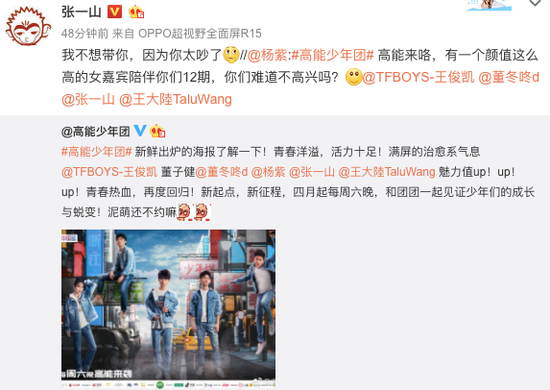 今日,《高能少年团》官微通过微博曝光主视觉海报,王俊凯、董子健、杨紫、张一山、王大陆身穿牛仔装,立于喧闹的城市街头,清新装扮少年气息十足。随后,杨紫转发该微博称“有一个颜值这么高的女嘉宾陪你们12期,你们难道不高兴吗?”张一山回应称“我不想带你,因为你太吵了。”杨紫回击“不想带我那就还钱吧”。