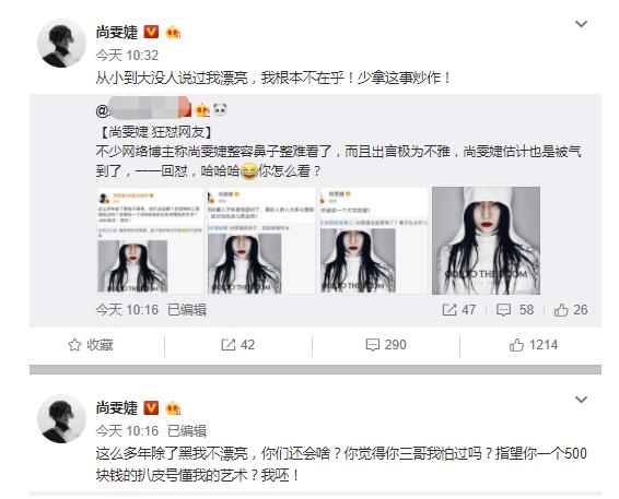 有博主质疑尚雯婕鼻子是整残了,尚雯婕转发怒怼:“哥反手送你一个大写的滚。”另有博主吐槽尚雯婕硬照里的鼻子真的很可怕,尚雯婕回复:“这么多年除了黑我不漂亮,你们还会啥?指望你一个500块钱的扒皮好懂我的艺术?Jolin说过:我呸!”最后尚雯婕再次转发微博表态度:“从小到大没人说过我漂亮,我根本不在乎!少拿这事炒作!”
