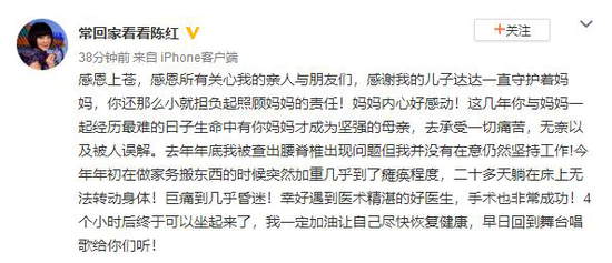 27日,陈红在网上发布了一条最新消息,回应之前重病抢救传闻:“感恩上苍,感恩所有关心我的亲人与朋友们,感谢我的儿子达达一直守护着妈妈,你还那么小就担负起照顾妈妈的责任!妈妈内心好感动!这几年你与妈妈一起经历最难的日子生命中有你妈妈才成为坚强的母亲,去承受一切痛苦,无奈以及被人误解。去年年底我被查出腰脊椎出现问题但我并没有在意仍然坚持工作!今年年初在做家务搬东西的时候突然加重几乎到了瘫痪程度,二十多天躺在床上无法转动身体!巨痛到几乎昏迷!幸好遇到医术精湛的好医生,手术也非常成功!4个小时后终于可以坐起来了,我一定加油让自己尽快恢复健康,早日回到舞台唱歌给你们听!”