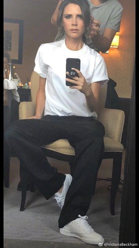 11月9日,维多利亚在微博晒出一张自拍照。照片中,贝嫂上身穿一件白T,下身搭一条黑色长裤,再配上一双白色休闲鞋,酷劲十足。