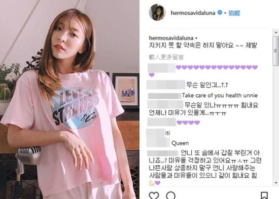 据香港媒体报道 最近推出新专辑《Night Reminiscin》的韩国女团f成员Luna,今日突然在Instagram上船新照并留下意味深长的话:“不能兑现的承诺,拜托就不要说。”不少粉丝留言担心她是否与所属的SM事务所不和,亦有人猜测是与f重组有关,粉丝纷纷留言叫Luna加油,希望她不要伤心。