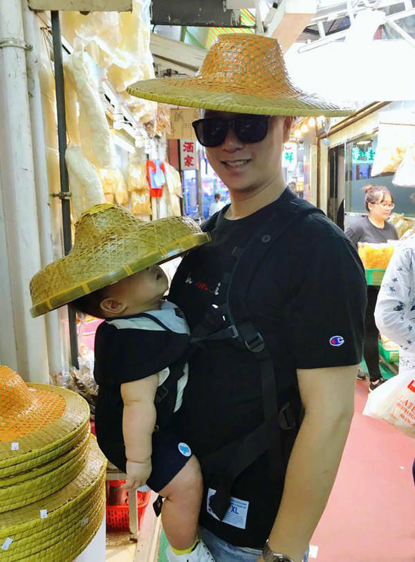 照片中,胡杏儿老公和儿子穿着亲子装,用背带将儿子挂在胸前,父子二人都戴着非常有特点的竹编帽子,儿子还因为帽子太大,整个脸都遮住了,仰起小脸不知所以的看着老爸,十分可爱呆萌。