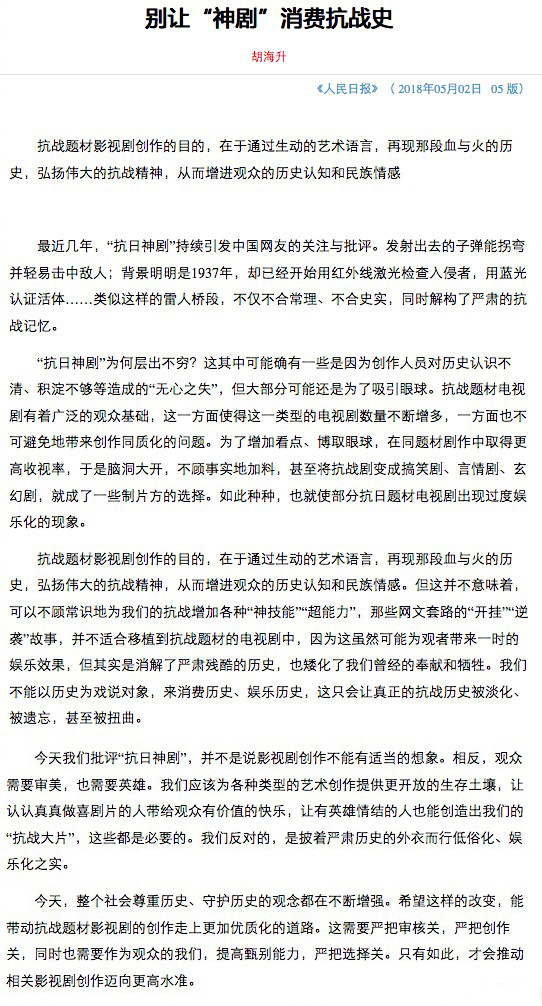 5月2日,人民日报发文称,最近几年,“抗日神剧”持续引发中国网友的关注与批评。各种雷人桥段频出,不仅不合常理、不合史实,同时解构了严肃的抗战记忆。我们不能以历史为戏说对象,来消费历史、娱乐历史,这只会让真正的抗战历史被淡化、被遗忘,甚至被扭曲。