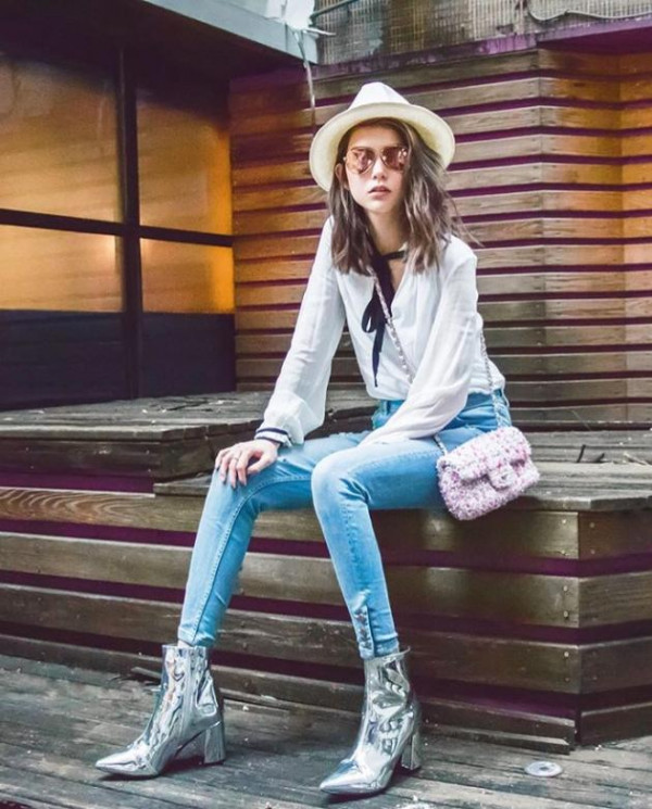 照片中,昆凌牛仔裤长袖薄衬衫,戴一顶圆形遮阳帽,微卷的头发时尚感十足。一双大床腿配脚上银色尖头鞋,仿佛杂志画报封面既视感。周杰伦立马赶来评论:“我来拍应该会更好。”
