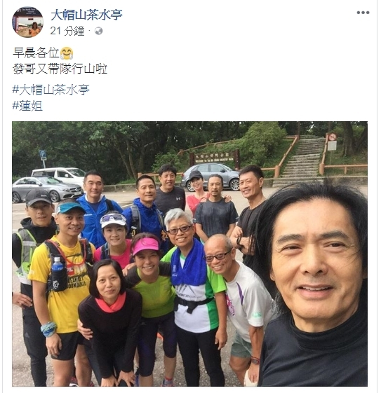 据香港媒体报道,周润发近年最爱的运动就是爬山,几乎风雨不改,他清晨7点左右就集齐爬山之友一齐跑各大山头,今天就有爬山之友撞见发哥,一个名叫大帽山茶水亭的网友在社交平台放出同发哥的合照,还留言:“发哥又带队爬山啦!大帽山被发哥照亮了!”