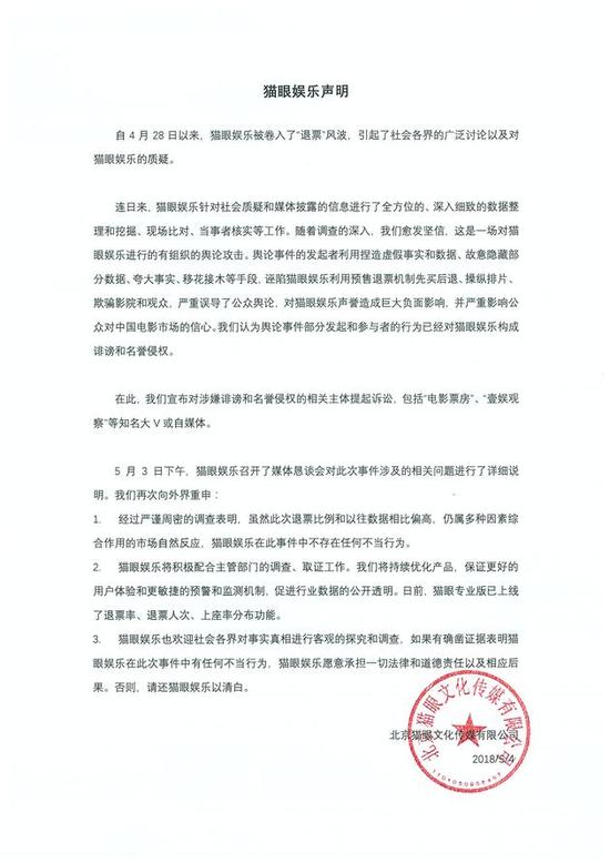 5月4日晚,猫眼再通过官方微博发布声明,否认“搅乱电影市场不当行为”同时,严肃指出近来遭受的多项指责纯属一场有组织的“诬陷”行为。猫眼明确表示,“舆论事件部分发起和参与者行为已经对猫眼娱乐构成诽谤和名誉侵权”,并宣布将起诉包括“电影票房”、“壹娱观察”在内的多个知名大V和自媒体。