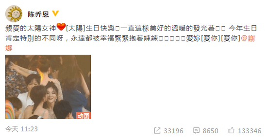 5月6日,陈乔恩发微博为谢娜庆生:“亲爱的太阳女神,生日快乐,一直这样美好的温暖的发光着,今年生日肯定特別的不同呀,永远都被幸福紧紧抱着啦啦,爱你@谢娜”。蒋欣也在下方回应:“她真的是太阳女神!给大家欢乐向上的力量”!