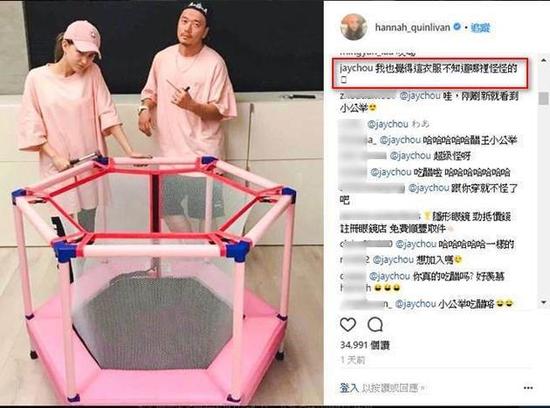 据台湾媒体报道歌坛天王周杰伦与昆凌是演艺圈中的模范夫妻档,小俩口也不时在网路上留言互动,昆凌日前则晒照,分享自己动手组弹跳垫,并与身旁男子同穿粉色上衣,两人穿情侣装钓出周杰伦留言“我也觉得这衣服不知道哪里怪怪的”,不过结局却是甜蜜爆表。