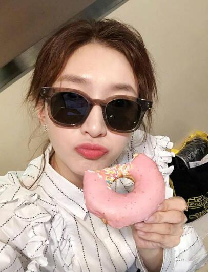 照片中,江疏影戴着黑超墨镜,皮肤白皙,嘟嘴卖萌,手拿甜甜圈,秒变吃货,大玩自拍,花边衬衫更是清新可人,满满的淑女范儿。