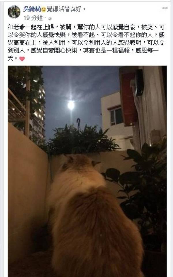 近日,吴绮莉在社交网上传了一张小猫在露天仰天望月的照片,并似有所指的留言表示:“和老爷一起在上课,被骂,骂你的人可以感觉自豪,被笑、可以令笑你的人感觉快乐,被看不起、可以令看不起你的人,感觉高高在上,被人利用,可以令利用人的人感觉聪明,可以令到别人,感觉自豪开心快乐,其实也是一种福报,感恩每一天。”