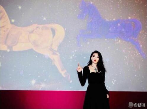 照片中,舒淇身穿黑色长裙,披着一头时尚的长卷发,红唇白皙,对镜嘟嘴卖萌,非常的漂亮又不失俏皮。身后大屏幕上是两匹不颜色的马,正在奋力向前奔跑。
