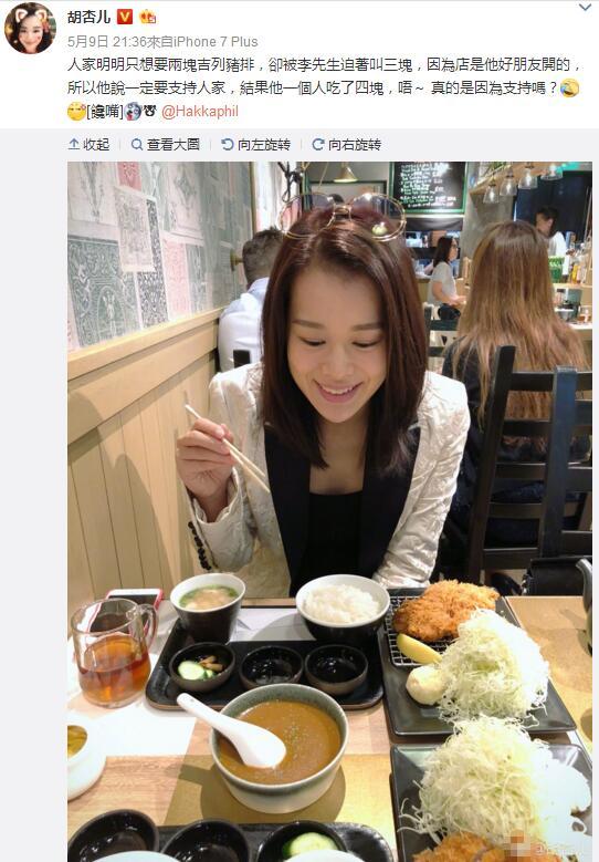 胡杏儿在微博上还配文表示:“人家明明只想要两块吉列猪排,却被李先生迫着叫三块,因为店是他好朋友开的,所以他说一定要支持人家,结果他一个人吃了四块,唔~ 真的是因为支持吗?”语气娇嗔却不做作,搭配照片中的一脸甜笑,看起来是真的十分幸福。有网友表示,你们在那边吃晚餐,而我们却在屏幕前吃狗粮啊!