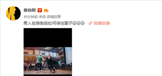10日,黄晓明晒出一段微博故事,视频里的他跟粉丝互动转圈时不慎摔倒,后为了挽尊在活动中又频频故意摔倒。黄晓明也无奈配文道:“男人在摔倒后如何保住面子。”网友们也被逗得乐不可支: