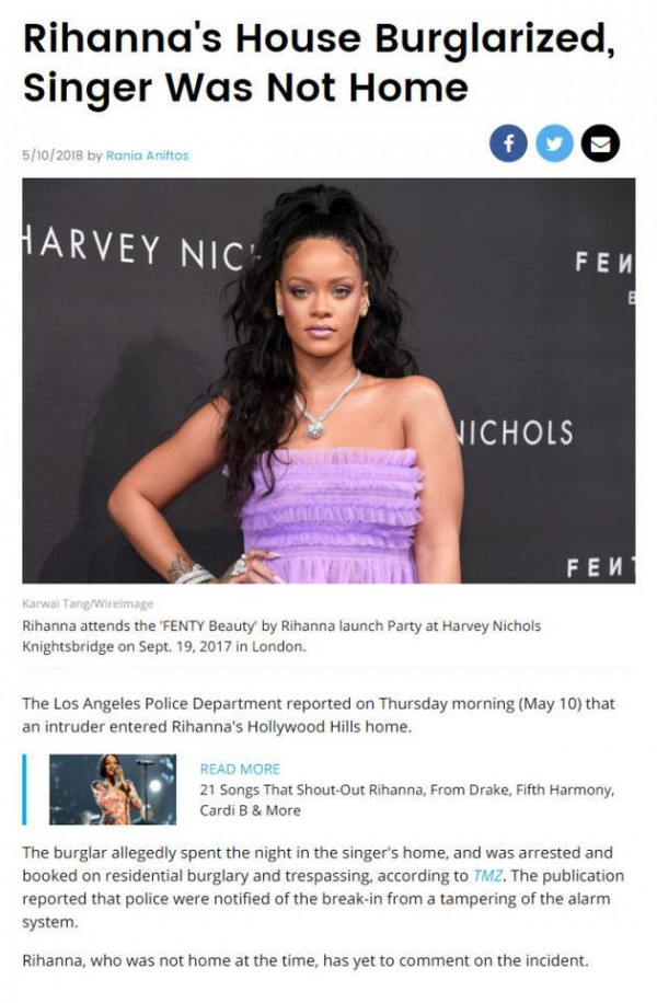 男子入侵蕾哈娜住宅住一晚后被捕 网友幽默回复