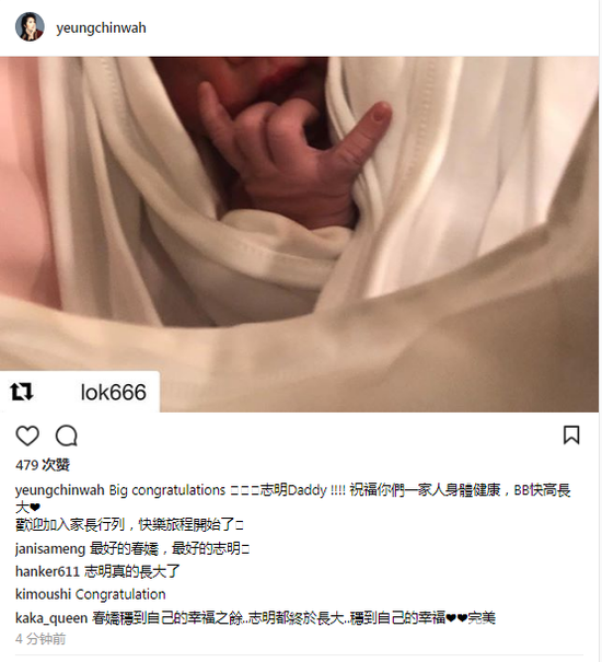 杨千嬅发文祝福余文乐10日,余文乐妻子王棠云剖腹产下一子,两人升级当爸妈,随后余文乐微博报喜,并公开儿子名字Cody Yue,晒出的照片中,小宝贝软萌可爱。11日,杨千嬅在个人社交网站发文祝福老搭档余