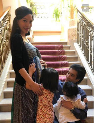 照片中王力宏怀抱两个女儿,右手抚摸爱妻大肚,特别温馨有爱。妻子李靓蕾穿吊带长裙和黑色开衫,看上去气色非常好。