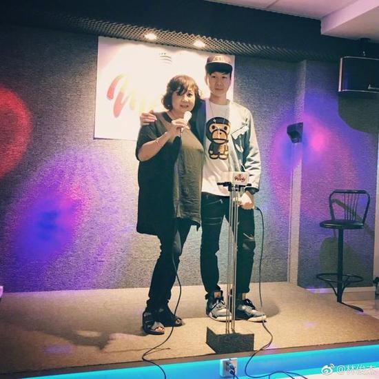 照片中,林俊杰和妈妈站在ktv舞台上,手里都拿着话筒,似乎正在唱歌。林俊杰搂着妈妈肩膀,妈妈也靠在JJ身边。