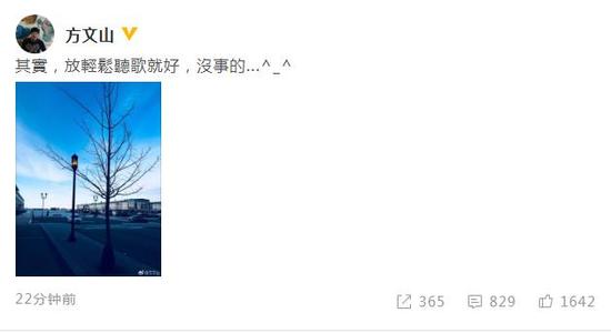 5月16日,方文山回应网友要他为周杰伦写歌词一事,他写道:“其实,放松听歌就好,没事的。”并配上微笑的表情。