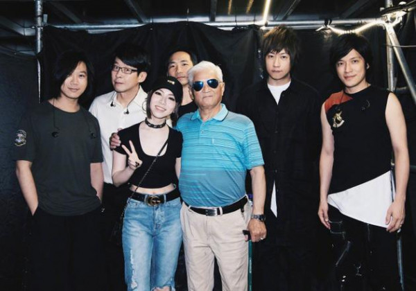 照片中,邓紫棋外公一头花白的头发,戴着黑超墨镜,身穿蓝色T恤,一脸的慈祥,十分的精神,将外孙女邓紫棋搂在怀里,五月天站在邓紫棋和外公身后,外公瞬间变成老顽童。
