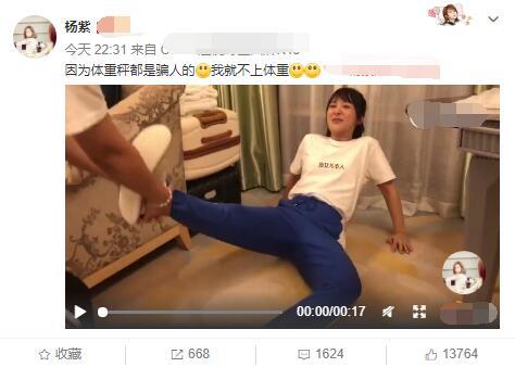 5月17日晚,杨紫通过社交媒体上传一段被助理拽着称体重的视频,并写道:“因为体重秤都是骗人的,我就不上体重。”