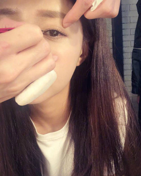 照片中,沈梦辰身穿白色T恤,披散着长发,由化妆师画着眼线。仔细观察,不难发现她眼下有皱纹,看起来真的十分疲惫了。