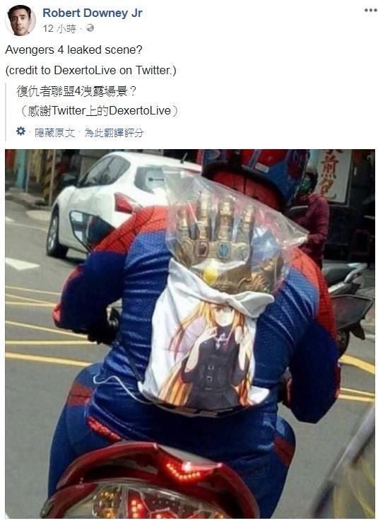 据台湾媒体报道,《复仇者联盟3:无限战争》热潮持续延烧,“钢铁侠”小罗伯特·唐尼17日突然在脸书PO出一张照片,可以看到一名男子骑车背着“无限手套”,结果被眼尖的网友抓包拍摄地点是在台湾!