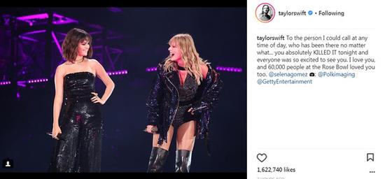 随后,泰勒也在社交平台上分享了与赛琳娜在台上的合照,并标记对方:“给那位我1天24小时,随时随地、无论如何都可以联络的人,你今晚的表现真的太棒了,所有人都很开心见到你!我爱你,还有Rose Bowl体育馆的6万人也都很爱妳。”其实两人在2014年传出不合后,赛琳娜先前曾在泰勒丝28岁生日当天,分享一段两人的影片,在社交平台上献上生日祝福,正式破冰,这一次也是两人在吵架后,首次再度同台,因此粉丝都非常兴奋也很激动,并喊话要两人永远都可以这么要好。