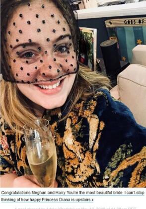 5月19日,30岁的阿黛尔在ins上晒出一张自拍。照片中她头戴垂着黑色半幅面纱的帽子,手举香槟,笑容可掬。阿黛尔为照片配文说:“恭喜梅根与哈里新婚,你是最美的新娘。我不禁在想戴安娜王妃的在天之灵该有多么高兴。”