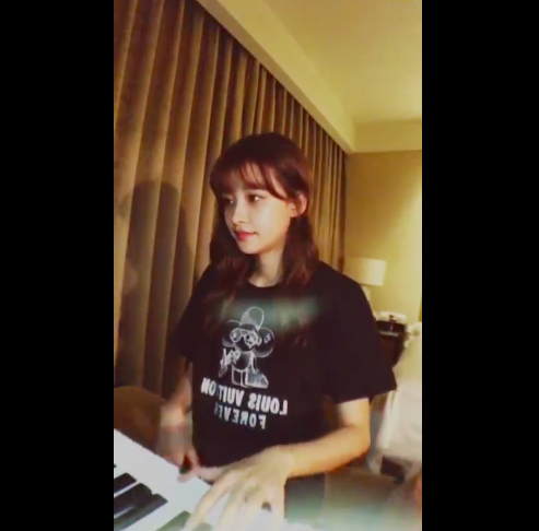 视频中,孙怡身穿黑色短袖,披着一头长发,坐在钢琴前,一边弹奏还一边俏皮的对着镜头甜笑,身体随着节拍慢慢摇摆,并情不自禁的唱了起来,声音柔美,十分的动听,满屏的文艺气息。
