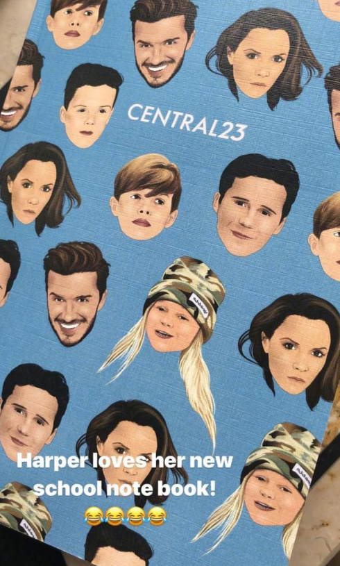5月24日,“贝嫂”维多利亚在自己的社交媒体上晒出一张照片,照片中,展示了小七的蓝色笔记本,上面印着贝克汉姆一家人的卡通头像,看起来惟妙惟肖,十分温馨。维多利亚在图片上配文:“Harper loves her new school note book!”