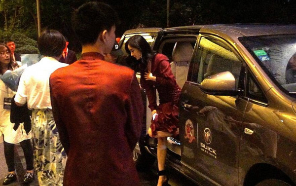 杨幂一身红装躲狗仔 急速下车低头匆匆进酒店