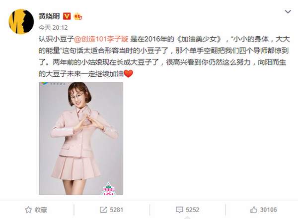 黄晓明发微博支持《创造101》的选手李子璇称“‘小小的身体,大大的能量’这句话太适合形容当时的小豆子了,那个单手空翻把我们四个导师都惊到了。两年前的小姑娘现在长成大豆子了,很高兴看到你仍然这么努力,向阳而生的大豆子未来一定继续加油”。