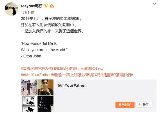 玛莎宣布当爸6月1日儿童节,五月天玛莎发微博宣布升级当爸,并透露妻子生下龙凤胎宝宝。玛莎在儿童节中午发文表示“2018年五月,双子座的弟弟和妹妹,终于在家人朋友们殷殷的期盼中,一起加入我们