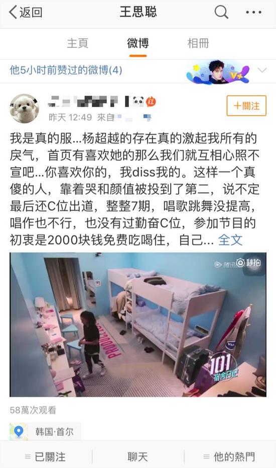 王思聪点赞网友吐槽《创造101》选手杨超越微博