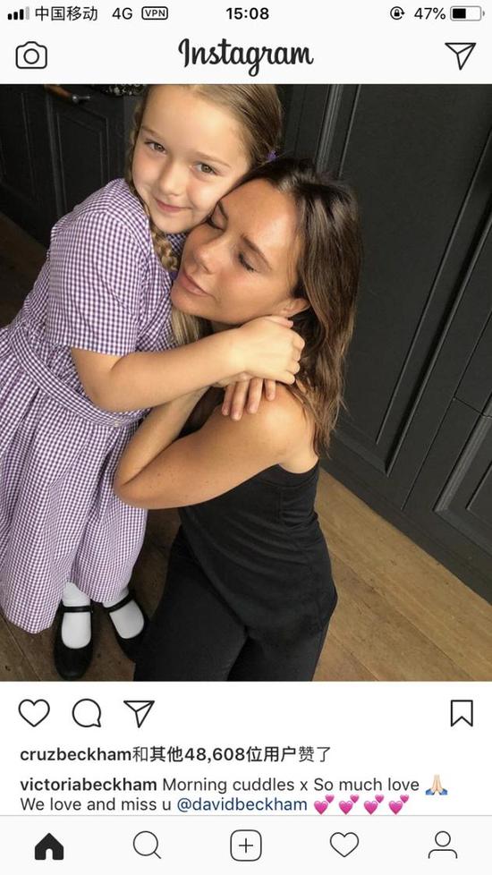 6月8日,贝嫂在自己社交网站上晒出一张照片,并配文称:“早安的拥抱!超爱你!我们都很想念你。”并艾特了老公贝克汉姆。照片中,贝嫂和小七仅仅相拥,小七面带微笑看着镜头,画面十分温馨。