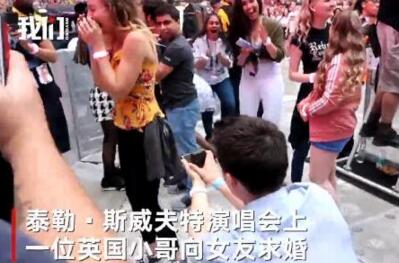 近日,Taylor Swift伦敦演唱会上,一男孩单膝下跪求婚,女友激动地不停点头,围观群众疯狂尖叫。他们相识于大学,因对音乐的热爱走在一起。伴随着歌曲《Love Story》,小哥为女友戴上戒指。