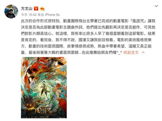 昨日,方文山终于发微博透露了新歌的迹象,这次他的创作灵感,竟然是来源于一部即将在暑期档公映的电影《风语咒》。据方文山微博透露,这部电影的制作方为邀请方文山为其主题曲写词,特地带着电影飞赴台北给其看片。