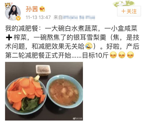 昨日,孙茜在微博Po出自己的第二轮减肥餐,并霸气地立下flag:“产后第二轮减肥餐正式开始……目标10斤”,引得一众网友纷纷求分享减肥餐搭配。