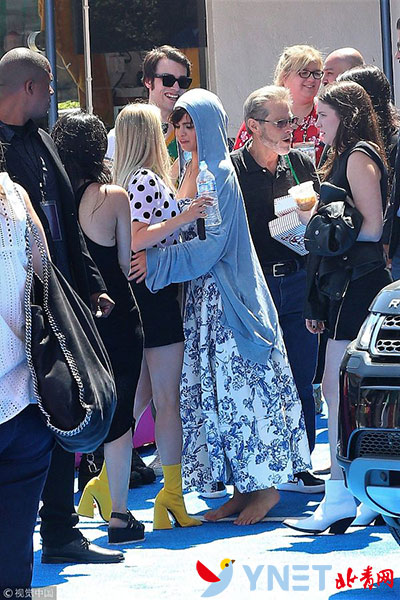 赛琳娜·戈麦斯身穿白底蓝花长裙外加蓝色连帽外套,光脚现身街头,在与粉丝拥抱时踮起双脚,十分俏皮可爱。声明:视觉中国供稿,未经授权严禁转载。