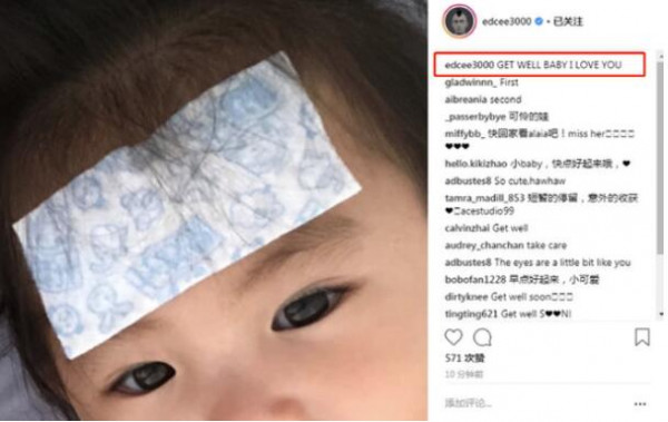 7月3日,陈冠希在个人社交账号中晒了一张女儿的照片。照片中女儿Alaia头上贴着退烧贴,从她的眼神中能看出整个人因发烧有点无精打采。陈冠希写道:“GET WELL BABY I LOVE YOU。”简单的一句话能看出陈冠希对女儿生病的心疼。