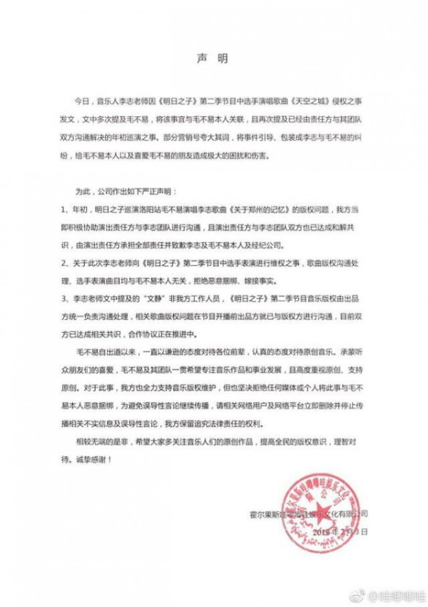 7月3日,毛不易公司哇唧唧哇娱乐文化有限公司发声明,就李志发长文控告明日之子侵权,且毛不易巡演曾翻唱也有连带责任一事进行回应。文中称:“李志老师文中多次提及毛不易,将该事宜与毛不易本人关联