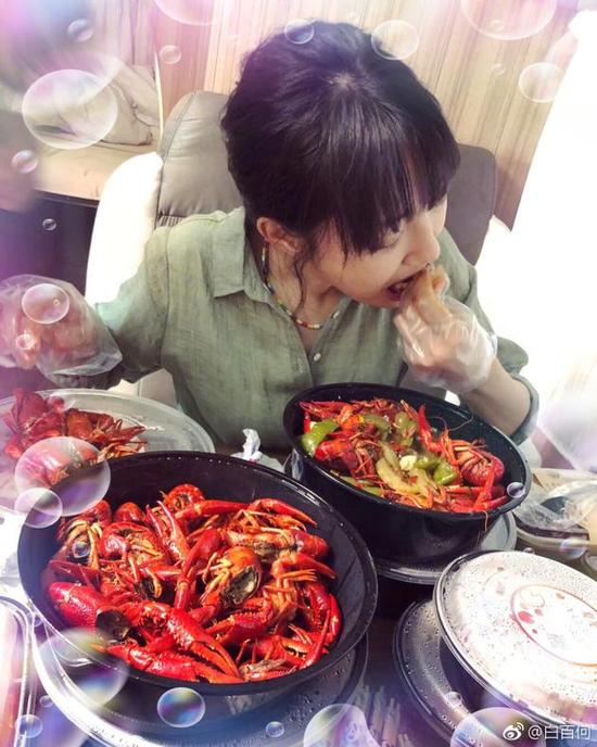 5日,白百何在微博晒近照。照片中的她正蹲在地上啃汉堡,眼睛笑成一条线。她还配文:“流水的食物,铁打的我,牛肉芝士汉堡了解一下!”再加上前一天晒出的吃小龙虾图,白百何最近彻底暴露吃货属性。