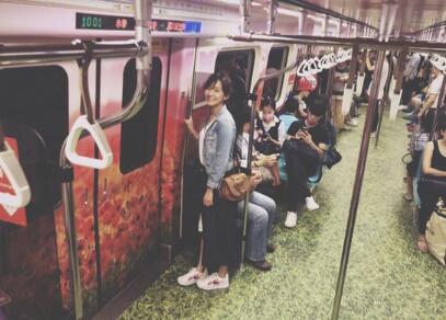 陈意涵搭地铁7月9日,陈意涵通过社交平台发文:“今天的捷运是绿色的,但你们在玩手机都没有看到,好可惜”。图片中的她正站在地铁车厢中,车厢的地板和她描述的一样是绿色的。她一身俏皮