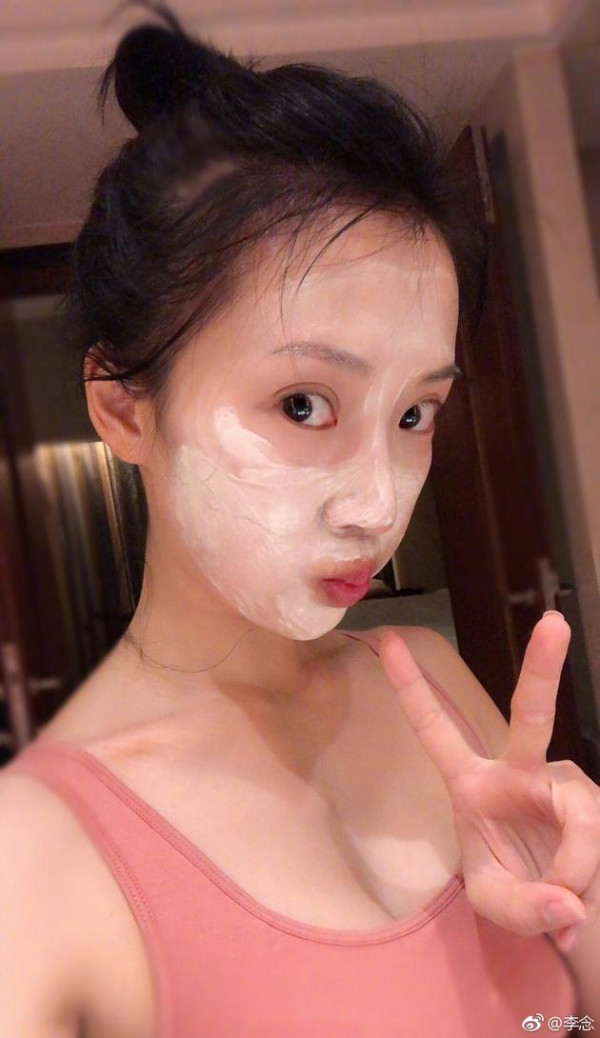 照片中,李念扎着丸子头,身穿粉色背心,对着镜头嘟嘴比V卖萌,脸上还敷着面膜,时刻不忘保养。